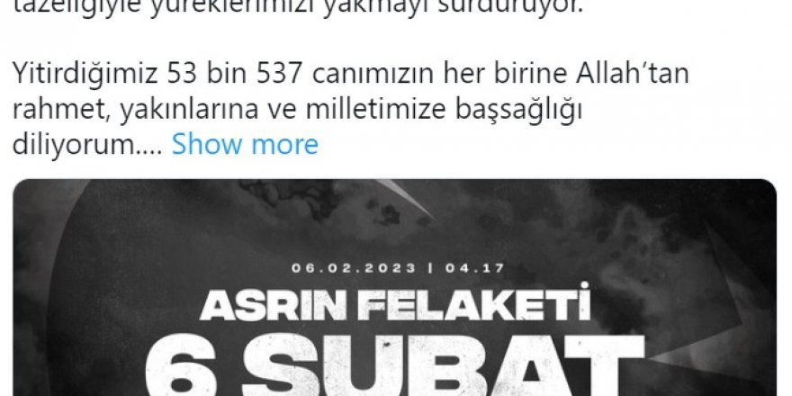 Cumhurbaşkanı Erdoğan, sosyal medya hesabından yayımladığı mesajında, bir yıl önce yaşanan Kahramanmaraş merkezli depremlerde hayatını kaybedenlerin acısının ilk günkü tazeliğiyle yürekleri yaktığını belirtti.