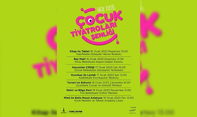 İzmir Büyükşehir Belediyesi, çocukları ara tatilden önce ücretsiz tiyatro gösterileri ile buluşturacak. Ara Tatil Çocuk Tiyatroları Şenliği kapsamında sergilenecek oyunlar, her gün aynı anda farklı sahnelerde olacak. Şenlik 16 Ocak Pazartesi günü saat 13.00’te Kadifekale Zübeyde Hanım İlkokulu’nda “Kitap ile Tablet”, Kiraz Belediyesi Kapalı Düğün Salonu’nda “Bay Maki” adlı tiyatro oyunları ile başlayacak.
