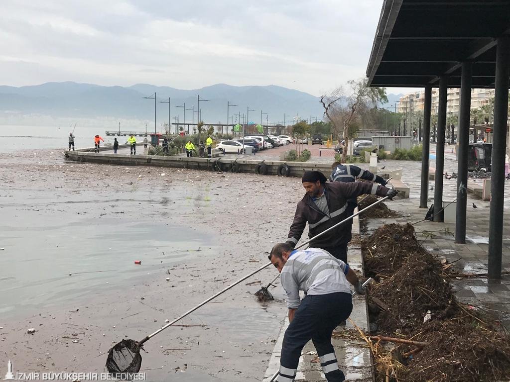 Körfez Denetim ekibi ise Körfez'e derelerden gelen yüzer çöpleri temizledi. Mavi Körfez 2 ve Mavi Körfez 3 deniz süpürge gemileri ve 15 kişilik kara çöp toplama ekibi, Bostanlı ve Karşıyaka’da 25 ton çöp topladı.