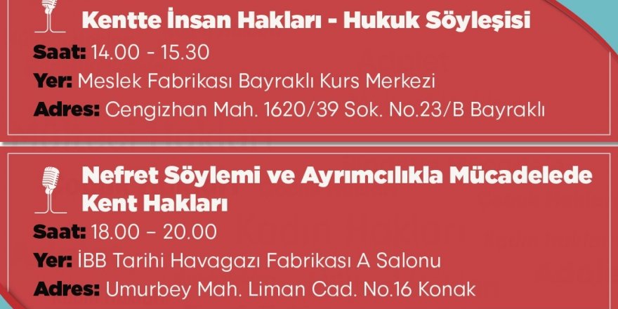 23 Kasım saat 14.00’te Meslek Fabrikası Bayraklı Kurs Merkezi’nde “Kentte İnsan Hakları” söyleşisiyle başlayacak etkinlik, 18.00’de Tarihi Havagazı Fabrikası A Salonu’nda “Nefret Söylemi ve Ayrımcılıkla Mücadelede Kent Hakları” konusuyla devam edecek.