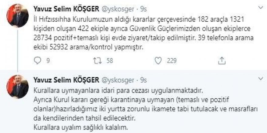 "İl Hıfzıssıhha Kurulumuzun aldığı kararlar çerçevesinde 182 araçla 1321 kişiden oluşan 422 ekiple, ayrıca güvenlik güçlerimizden oluşan ekiplerce 28 bin 734 pozitif ve temaslı kişi evde ziyaret/takip edilmiştir. 39 telefonla arama ekibi, 52 bin 932 arama ve kontrol yapmıştır. Kurallara uymayanlara idari para cezası uygulanmaktadır. Ayrıca kurul kararı gereği karantinaya uymayan (temaslı ve pozitif olanlar) hazırladığımız iki yurtta zorunlu ikamete tabi tutulacak ve masrafları da kendilerinden tahsil edilecektir. Kurallara uyalım, sağlıklı kalalım."