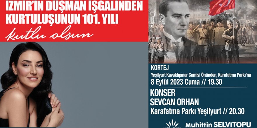 İzmir'in düşman işgalinden kurtuluşunun 101. yıldönümü, Karabağlar Belediyesi tarafından düzenlenen geleneksel kortej yürüyüşü ve Sevcan Orhan Konseri'yle kutlanacak.