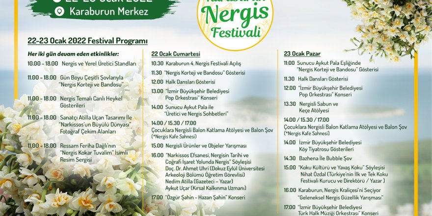 Karaburun Belediyesi tarafından, İzmir Büyükşehir Belediyesi ile destekleri ile bu yıl 4’üncü kez düzenlenecek Nergis Festivali 22-23 Ocak tarihleri arasında ilçe merkezinde gerçekleştirilecek. İki gün boyunca İzmir’den ve farklı illerden yaklaşık 200 bin ziyaretçiyi ağırlaması beklenen festivalde, yerel üretici stantlarında yöresel lezzetlerin yanı sıra nergis satışı da yapılacak.