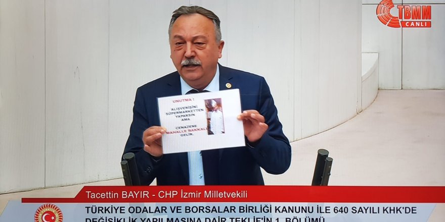 Görüşülmeye devam eden Türkiye Odalar ve Borsalar Birliği ile Odalar ve Borsalar Kanunu ile Bazı Kanunlarda ve 640 Sayılı Kanun Hükmünde Kararnamede Değişiklik Yapılmasına Dair Kanun Teklifinin 1. Bölümü üzerine, CHP Grubu adına söz alan İzmir Milletvekili Tacettin Bayır, 2014 yılında TRT 1’de yayından kaldırılan ‘’Leyla ile Mecnun’’ dizisinde yer alan Erdal Bakkal karakterinin sözüne atıfta bulunup, "Siz büyük marketlerden alışveriş yaparsınız ama cenazenize mahalle bakkalı gelir" görselini paylaşarak, ‘’Mahallenin ortak unsuru olan, evimizin, anahtarını bıraktığımız, güven duyduğumuz, veresiye yazdırdığımız, evliliği, cenazeyi, doğumu, düğünü öğrendiğimiz, mahalle kültürünün mihenk taşı olan bakkal amcayı korumak yerine, kapatılmasına neden olacağız’’ ifadesini kullandı.