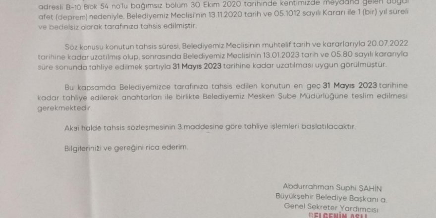 AK Parti İzmir Milletvekili Ceyda Bölünmez Çankırı, ayrıca CHP'li İzmir Büyükşehir Belediyesi tarafından tebligatla geçici konutlarından ayrılmak zorunda bırakılan depremzede ailelere yeni konut tahsis edeceklerini duyurdu.