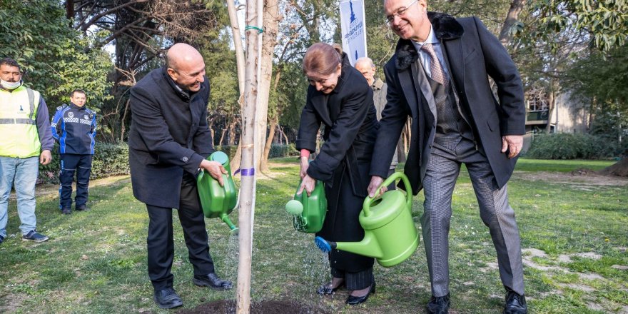 Başkan Soyer ise Başkonsolos Cordeiro Dunlop’a zeytin fidanı hediye etti.