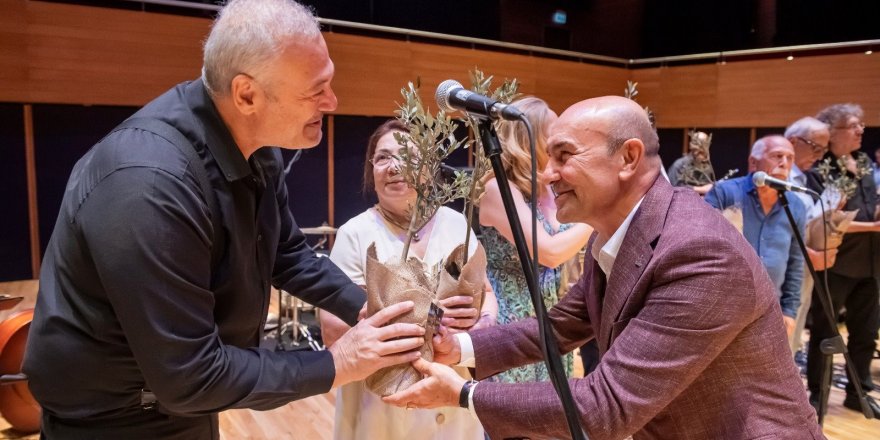 Gecenin sonunda Başkan Soyer sanatçılara zeytin fidanı verdi.