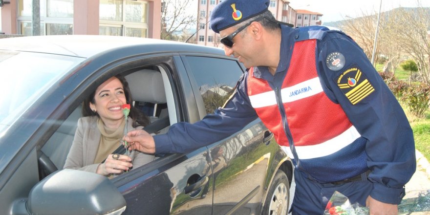 Ödemiş ilçesinde jandarma ekipleri 8 Mart Dünya Kadınlar Günü dolayısıyla kadın sürücü ve yolculara karanfil verdi.