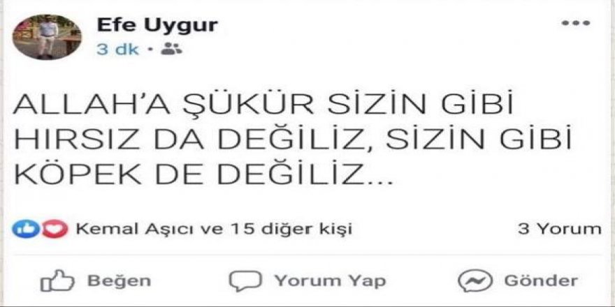 Torbalı Belediye Başkanı Uygur’un müdür yardımcılığına atanan oğlu Efe Uygur ise skandal bir mesaj paylaştı. Uygur, kendisine gelen tepkiler sonrasında kişisel sosyal medya hesabından “Allah’a şükür sizin gibi hırsız da değiliz, sizin gibi köpek de değiliz…” dedi.