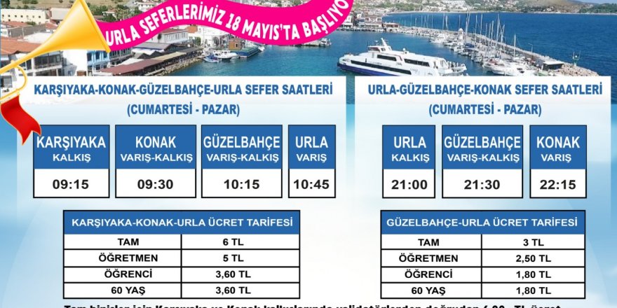 18 Mayıs'tan itibaren Cumartesi ve Pazar günleri olmak üzere yapılacak seferler için ilk hareket 09.15'te Karşıyaka İskelesi'nden olacak. Sırasıyla Konak ve Güzelbahçe'ye uğradıktan sonra 10.45'te Urla'da Büyükşehir Belediyesi'nin özel olarak yaptırdığı yüzer iskelede sefer tamamlanacak. Urla'dan İzmir'e dönüş seferi ise saat 21.00'de yapılacak. Sefer, Konak iskelesinde 22.15'te tamamlanacak.