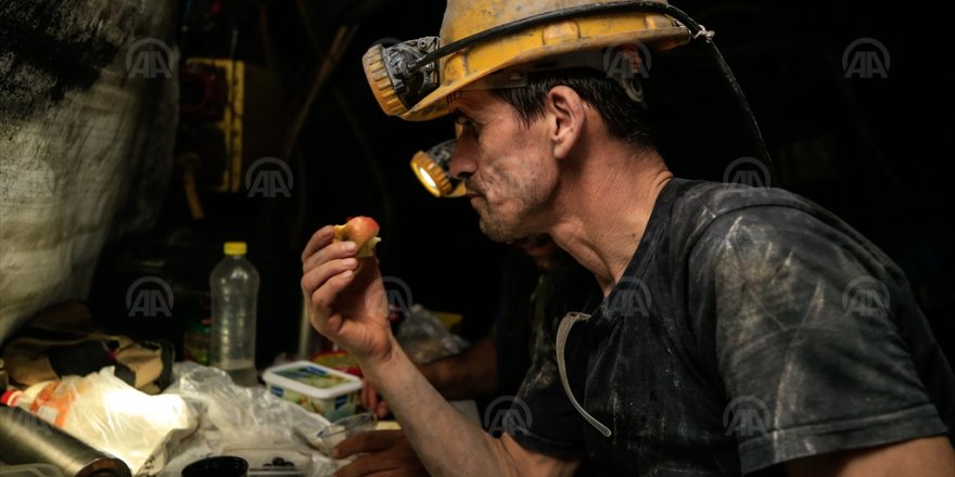 İlçeye bağlı bağlı Eynez Mahallesi'nde özel bir şirket tarafından işletilen maden ocağında çalışan işçiler, iftar vaktinin yaklaşmasıyla baretlerinin ışığının aydınlattığı karanlık dehlizde ahşap direk ve kalaslardan masalarını oluşturdu.